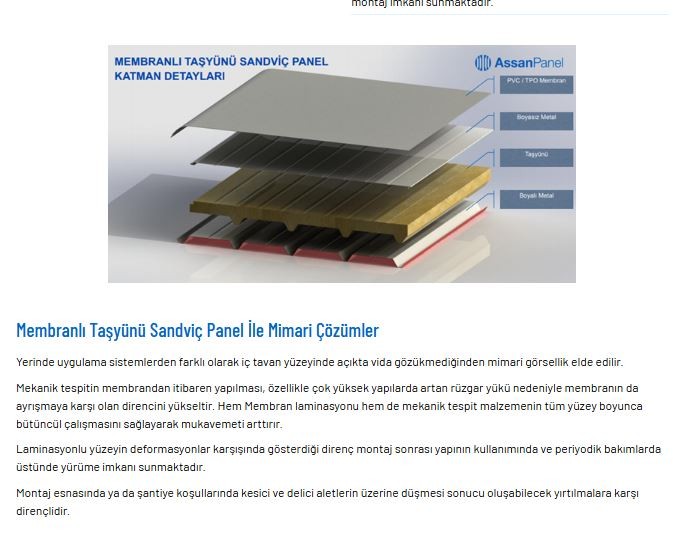 Minimum %1,5 eğimli çatılarda, gerekli su ve ısı izolasyonunu sağlayan, yüksek yangın dayanımlı çatı kaplama malzemesidir. Yerinde uygulamalara oranla çok daha hızlı ve kolay ve ekonomik montaj imkanı vardır. N5T Membranlı Çatı Panelinde, membran direkt olarak bir dolgu malzemesine değil de metale yapışmaktadır. Basma mukavemeti yüksektir, membran yüzeyde oluşabilecek şekil değiştirme, iz ve katlanmaların önüne geçerek görsel olarak avantaj sağladığı gibi taşıma kapasitesini de arttırmaktadır. PVC ve ya TPO membranlı olarak tercih edilebilir.